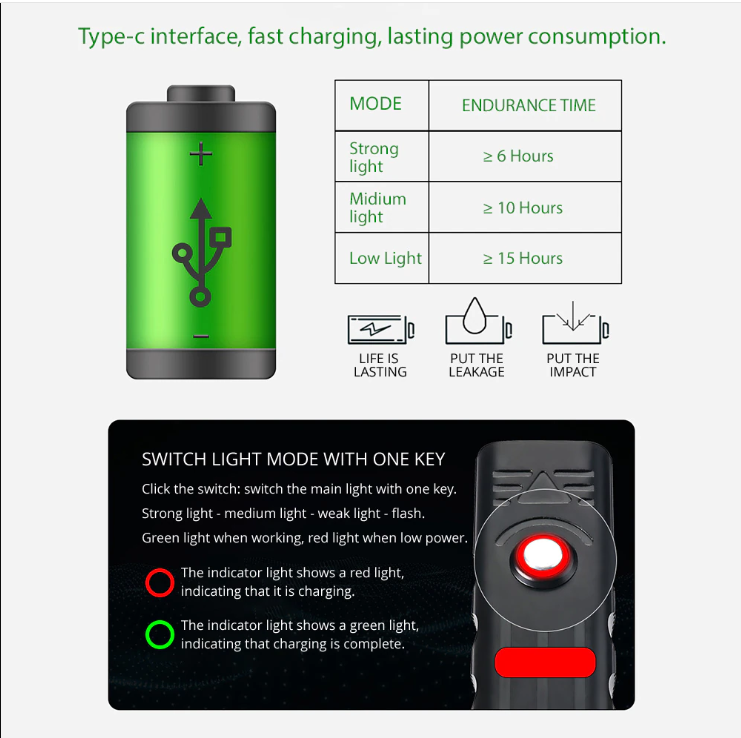 Dauerbetriebszeit: 6 Stunden im High-Modus, ca. 18 Stunden volles Ladegerät