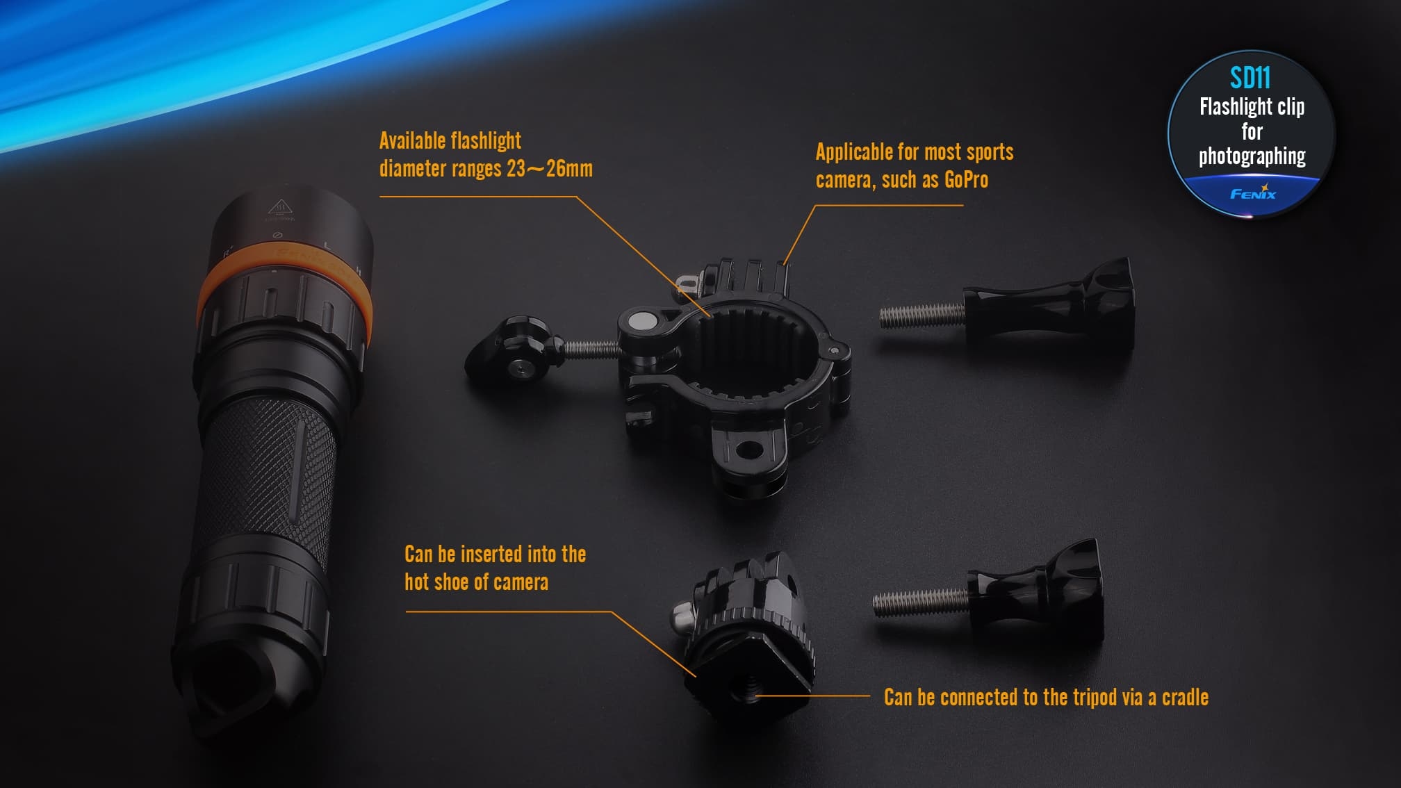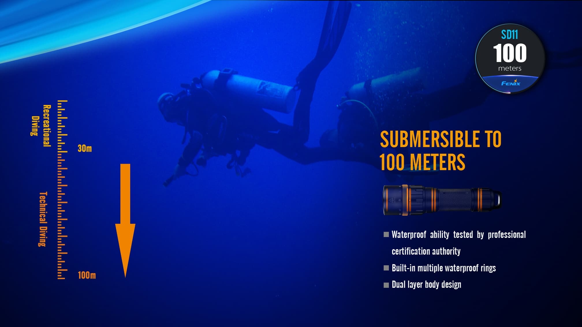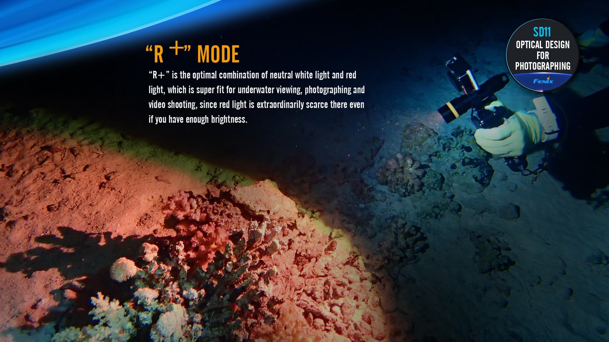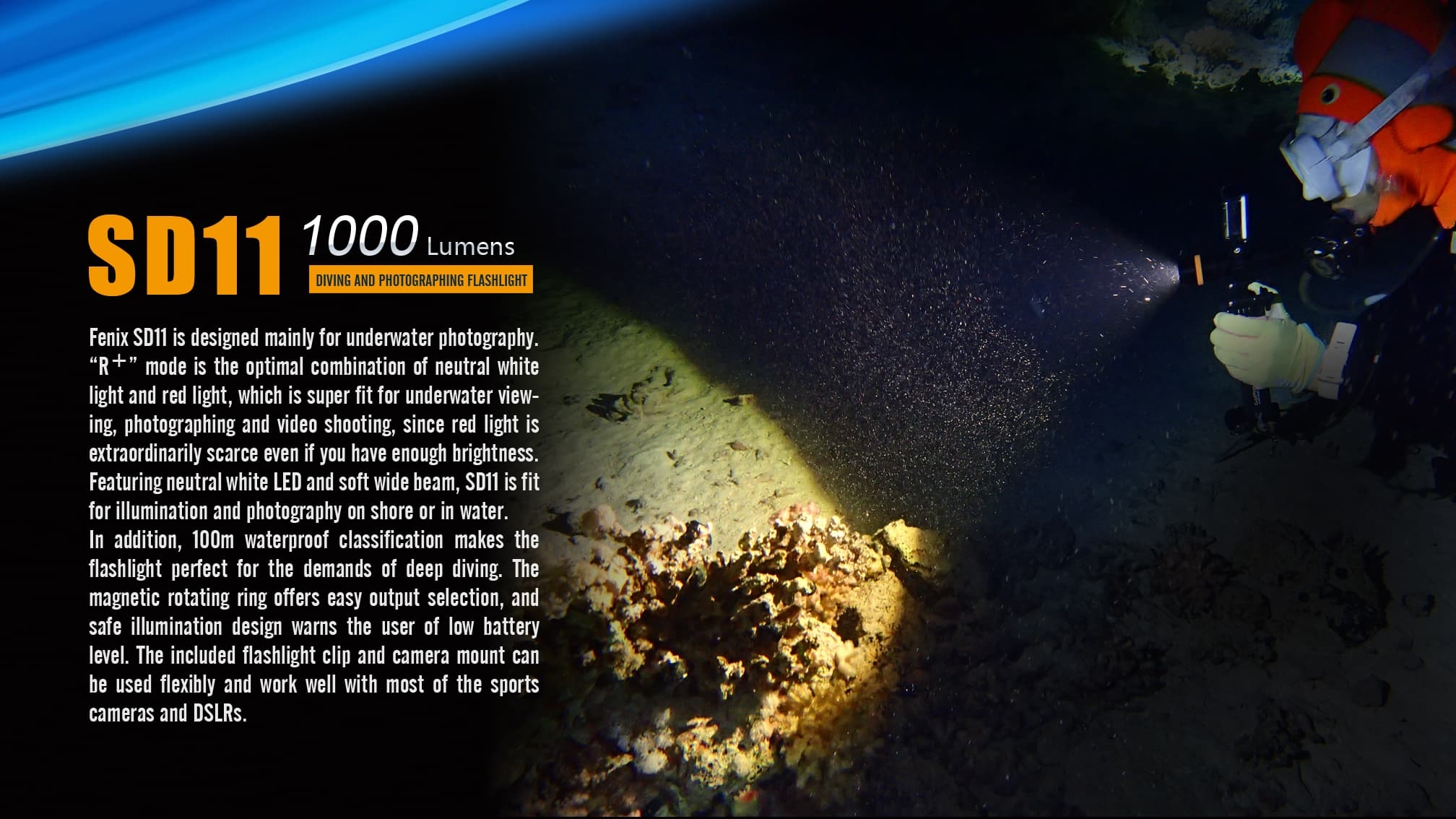 Fenix SD11 wurde hauptsächlich für die Unterwasserfotografie entwickelt. Der „R +“ - Modus ist die optimale Kombination aus neutralem weißem Licht und rotem Licht, die sich hervorragend zum Betrachten, Fotografieren und Aufnehmen von Unterwasser eignet, da rotes Licht auch bei ausreichender Helligkeit außerordentlich selten ist. Der SD11 verfügt über eine neutralweiße LED und einen weichen Breitstrahl und eignet sich für Beleuchtung und Fotografie an Land oder im Wasser. Darüber hinaus macht die 100 m wasserdichte Klassifizierung die Taschenlampe perfekt für die Anforderungen des Tieftauchens. Der magnetische Drehring bietet eine einfache Auswahl des Ausgangs und ein sicheres Beleuchtungsdesign warnt den Benutzer vor niedrigem Batteriestand. Der mitgelieferte Taschenlampenclip und die Kamerahalterung können flexibel verwendet werden und funktionieren gut mit den meisten Sportkameras und DSLRs.