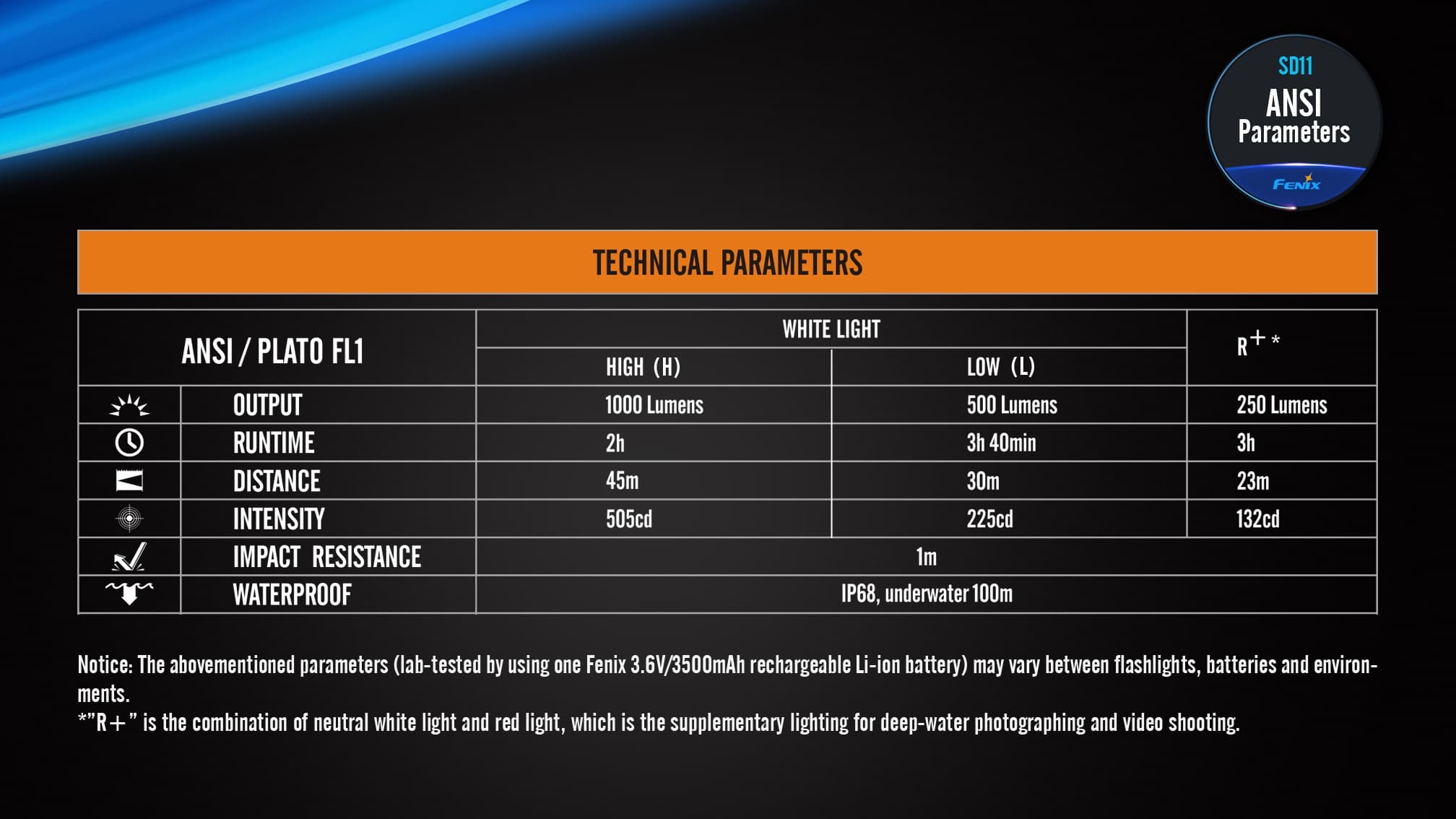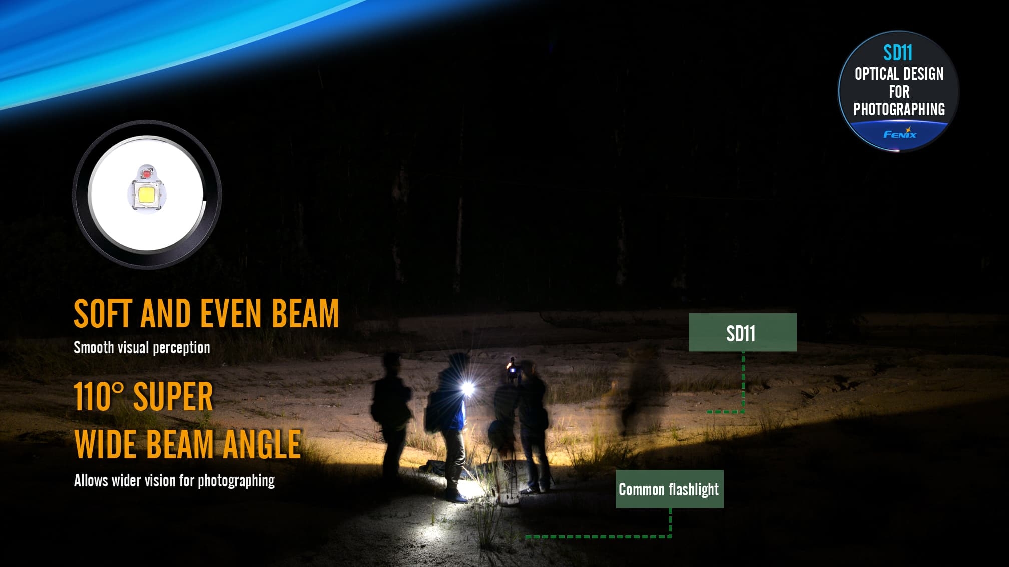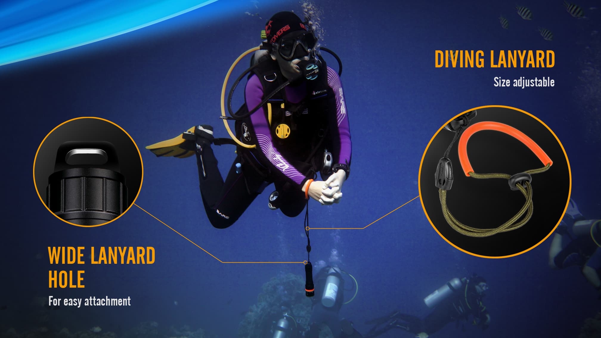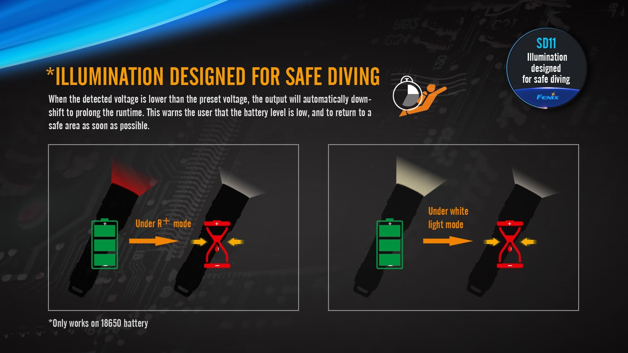 Fenix SD11 wurde hauptsächlich für die Unterwasserfotografie entwickelt. Der „R +“ - Modus ist die optimale Kombination aus neutralem weißem Licht und rotem Licht, die sich hervorragend zum Betrachten, Fotografieren und Aufnehmen von Unterwasser eignet, da rotes Licht auch bei ausreichender Helligkeit außerordentlich selten ist. Der SD11 verfügt über eine neutralweiße LED und einen weichen Breitstrahl und eignet sich für Beleuchtung und Fotografie an Land oder im Wasser. Darüber hinaus macht die 100 m wasserdichte Klassifizierung die Taschenlampe perfekt für die Anforderungen des Tieftauchens. Der magnetische Drehring bietet eine einfache Auswahl des Ausgangs und ein sicheres Beleuchtungsdesign warnt den Benutzer vor niedrigem Batteriestand. Der mitgelieferte Taschenlampenclip und die Kamerahalterung können flexibel verwendet werden und funktionieren gut mit den meisten Sportkameras und DSLRs.
